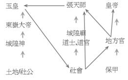 除了在庙里为家庭提供的这些主要的仪式服务之外, 道士也影响了地方社区的整合, 特别是以土地公为中心组织起来的里社, 而土地公正是城隍的下属。有一个明显的例子, 可以说明城隍在道教官僚框架下整合附近土地公的逻辑。17世纪起, 大致在从南京到上海之间的这个特殊区域, 城隍与土地公的关系有一种特殊的形式。在该区域, 每个地方社区(村庄和邻近地区) 每年都要以土地公的名义,向每家每户征收纸钱, 作为天国的税收, 然后由香会组织朝圣的队伍抬着这些“税”和土地公的神像, 前往当地的核心宫观(通常为道士掌管的城隍庙、东帝庙、或玉皇庙) , 焚化这些纸钱。这个仪式称为“解天饷”, 或“解钱粮”、“解皇钱”。在有的地区, 城隍还要依次向其上级(东岳大帝或玉皇大帝) 朝贡并转输“天饷”。许多学者研究过在“天饷”制度框架中地方庙宇的等级结构,18然而,对道教官僚体统整体的组织结构, 学界的探讨尚显不足。
