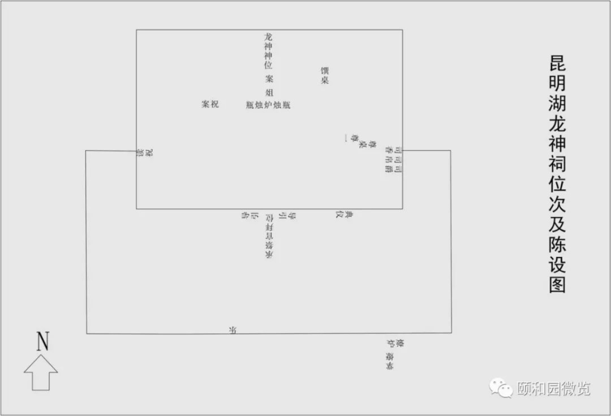 黑龙潭龙王庙的祭祀礼节与秋祭都城隍庙同,《大清会典事例》记载的祭都城隍庙的仪式是:黎明承祭官朝服诣庙。赞引太常寺赞礼郎二人,引承祭官由左侧门入,赞盥洗。承祭官盥手毕,升东阶,至拜位前,北面立。典仪赞执事官各共乃职。赞礼郎赞就位。承祭官就位立。典仪赞迎神。乐作。赞礼郎赞就上香位,引承祭官入殿中门至香炉前立,赞上香,司香跪奉香,承祭官上炷香,三上瓣香毕,赞复位,承祭官复位立。赞跪叩兴,承祭官行三跪九叩礼兴。典仪赞奠帛爵行初献礼。司帛跪献篚于案,三叩兴。司爵献爵于正中,皆退。司祝诣祝案前三叩兴,奉祝版跪案左。乐暂止。典仪赞读祝,赞礼郎赞跪,承祭官跪,司祝读祝毕,兴,奉祝版跪安于篚内,叩如初,兴退。乐作。赞礼郎赞叩兴,承祭官行三叩礼兴,典仪赞行亚献礼,司爵奉爵献于左,如初献仪,退。典仪赞行终献礼,司爵奉爵献于右,如亚献仪,退。典仪赞送神,赞礼郎赞跪叩兴,承祭官行三跪九叩礼兴。典仪赞奉祝帛送燎,司祝、司帛诣神位前跪三叩。奉祝帛兴,司香跪奉香兴,以次送至燎所,承祭官避立拜位西,俟祝帛过,复位立。典仪赞望燎,赞礼郎引承祭官诣燎位视燎。赞礼郎引承祭官仍由东侧门出。乐止。各退……送神时典仪赞撤饌,有司乃撤。从昆明湖龙神祠位次图可知,图中的导引二人就是赞礼郎,余下的参与仪式者都与都城隍庙相同,过程也确实同祭黑龙潭龙王庙一样,要经历“迎神,上香,初献,读祝,亚献,三献,撤饌,送神望燎”等步骤。仪式中乐部和声署所奏乐为庆神欢乐,为清代群祀所奏之乐。《大清会典事例》中记载庆神欢乐的标准配置是:鼓一,笙一,管二,云罗一,笛二,拍板一。位次图中也有乐工的位置。