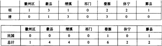 【4】资料来源:康熙《徽州府志》、康熙《狱县志》、民国《欺县志》、熹庆《绩溪县志》、康熙《委源县志》、乾隆《姿源县志》、民国《重修姿源县志》、康熙《休宁县志》、嘉庆《休宁县志》、嘉庆《攀县志》、民国《序县四志》。