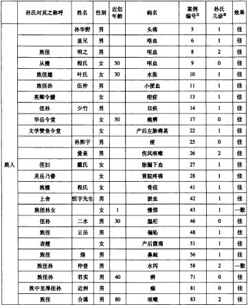 孙氏在为族人的治疗中,男性有40例,女性有42例,男女的比例基本上持平。在年龄上,有记载的为16位,小于15岁的共有4位,在15岁至59岁之间的有7位,大于59岁的有5位,其中最小的为1岁,最大的为83岁。其余没有年龄记载的估计应为壮年居多。从这些数据中可以看出,孙氏行医救治的族人几乎包括了族人中的每个群体。在这里需要特别指出的是,孙氏也曾经治疗过8位族仆,包括了幼科、妇科、瘟疫、内科等多种疾病,可见族医治疗的范围进一步扩大到了能够影响宗族生存的族仆身上,这也就使得宗族对疾病的预防与对抗能力进一步提高。如,孙氏在治疗族仆的过程中,前后有两位是瘟疫患者,其一是年三十的仆妇,她已经患瘟疫一月余,并且经常因劳、食等复发,孙氏先后三次为其开方,最终痊愈;另一位是外出绩溪的仆人途中因劳倦染上了瘟疫,在绩溪治疗时被医误用仙丹而导致严重的泄泻,急速归家后孙氏为之开方八次,蝎尽全力使之治愈。这二例在某种程度上说明宗族一面将保障的范围逐步扩大到了某些族仆身上(因族仆居住在村落周边),另一方面面对可能导致宗族范围内更严重的疾病流行之时,族医试图将之压到最小的范围之内。