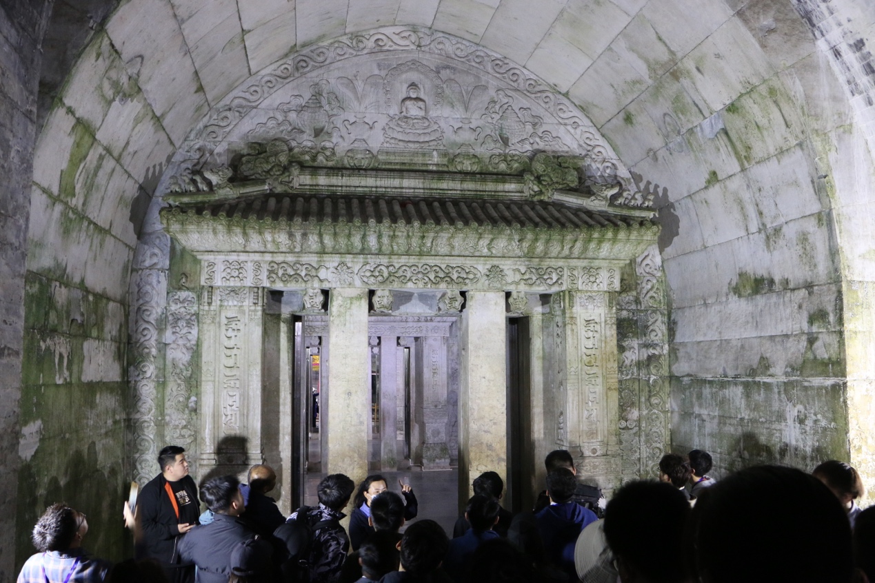 出慈禧陵向东,于林路穿行,树荫铺地,凉意渐起,清高宗裕陵忽然于林路尽头出现,其门前平坦开阔,阴翳骤消,有豁然开朗之感。裕陵背靠群峰,罗城周密,庄严有序,金色屋顶在阳光下熠熠生辉,虽历百年,乾隆盛世余韵不减。裕陵明楼台基既高且陡,使人难以抬头挺腰上前,据说这正是为迫使拜谒人等低头弯腰而故意为之。裕陵地宫中葬有清高宗,并合葬两位皇后及三位皇贵妃。讲解员老师为师生介绍了清理裕陵时所见地宫内布置与情景。尤其引考察师生瞩目的是,地宫内遍布佛、菩萨、天王等雕像,四壁刻满藏文佛经,尽显佛国景象。仔细观察藏文佛经,其多处为同一字母连续重复出现,含义难解,引得考察师生频频讨论。考察所见,裕陵地面地下建筑融满汉藏、儒释道等元素于一身,体现清高宗独特的个人审美与内心世界,也可看出乾隆朝多元一体、政教合一政治的别样面貌。