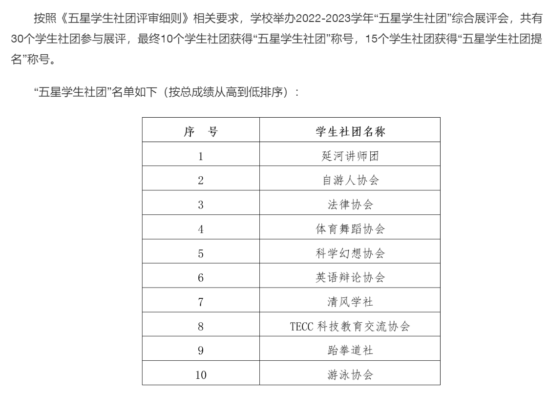 2023年9月15日下午,在中国人民大学校团委学生社团服务中心举办的2022—2023学年校级“五星学生社团”展评会中,清风学社以第七名的成绩蝉联“五星学生社团”称号,充分展现出学社青年寓学于乐、昂扬向上的精神风貌。