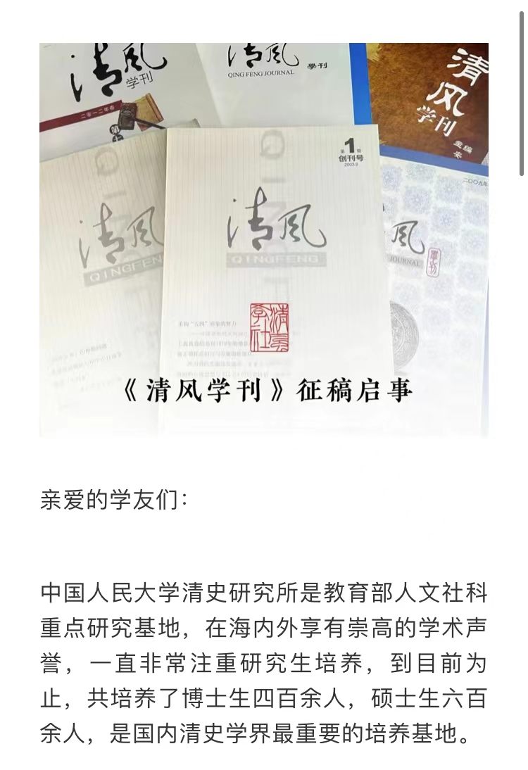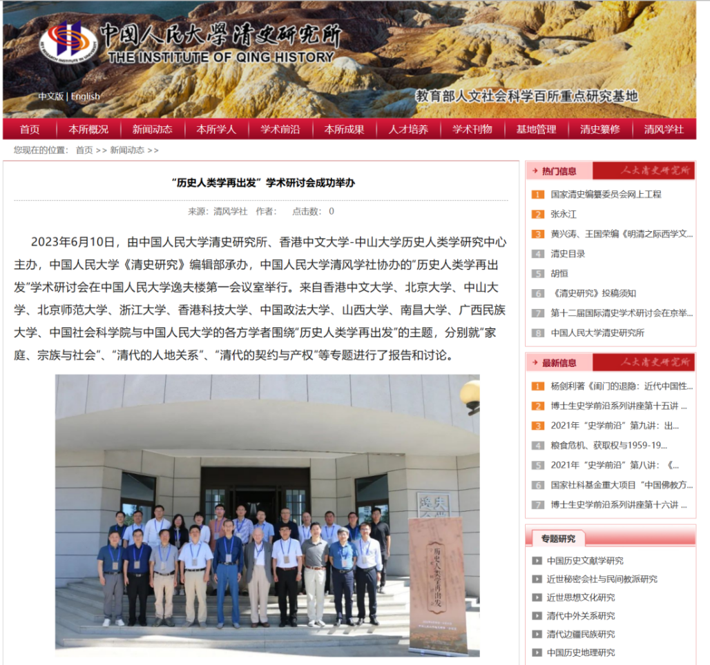 中国人民大学清史研究所官网设有“清风学社”专栏,并报道与转载学社开展的相关活动
