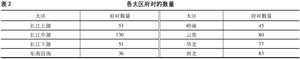 依据施坚雅对中国的大区划分,分别对各大区内相邻府对进行统计,一共产生555组府对,各大区府对的具体数量如表2所示。