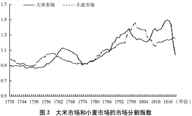 如果我们按粮食品种来划分市场,比较大米市场和小麦市场,则可以检验长江上游和云贵区域市场对整体市场整合程度的影响。大米市场仍然包括上述南方的六大区域,而小麦市场则将长江流域三个大区也纳入,即小麦市场包括长江上游、中游、下游和华北、西北五大区域。从图2可以看到,大米市场和小麦市场的整合程度在1738-1820年间仍然表现出长期稳定后逐渐减弱的趋势,在18世纪末出现明显的减弱趋势。大米市场和小麦市场两者的整合程度基本上是不相上下的关系,没有出现明显的差异。但我们也注意到,包括了长江上游、中游和下游三大区域市场的小麦市场,较之仅包括北方市场的小麦市场,其整合程度有所减弱,可见单就小麦市场而言,长江上、中游地区市场的整合程度不如北方市场。