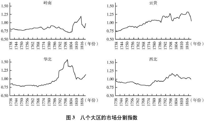第二,各个大区市场整合的趋势和周期不一致。岭南、东南沿海和长江下游三个大区在整个研究时段内市场整合程度都没有出现明显下降的趋势,基本稳定在较高水平上。而其余大区则在不同程度上都出现了市场整合程度下降的趋势,时间基本在18世纪末,而云贵地区下降的时间最早,在18世纪中期就已经开始下降。