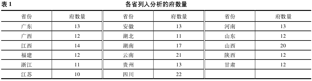 根据各省粮价数据质量的情况,一共有238个府被列入分析,具体数量如表1所示。
