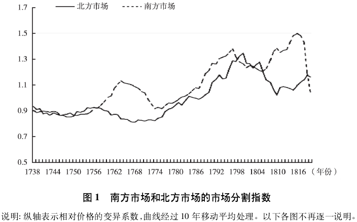从整体趋势来看,在时间上,南方市场(包括华南、东南沿海、云贵、长江上游、长江中游和长江下游六个大区的大米市场)和北方市场(仅包括华北和西北两个大区的小麦市场)的两条变异系数曲线在1738-1820年间呈现前期平稳、后期上升的趋势。也就是说,市场整合程度呈现出一个前期稳定、后期逐渐减弱的趋势,转折点出现在1800年左右,此后市场整合程度开始逐渐减弱并且波动幅度变大。