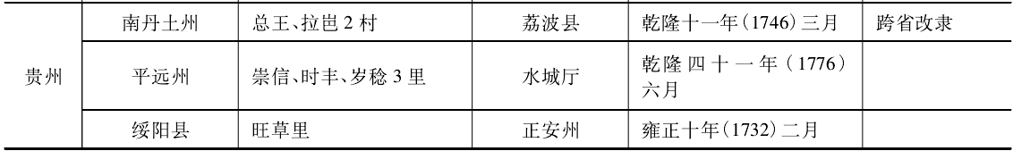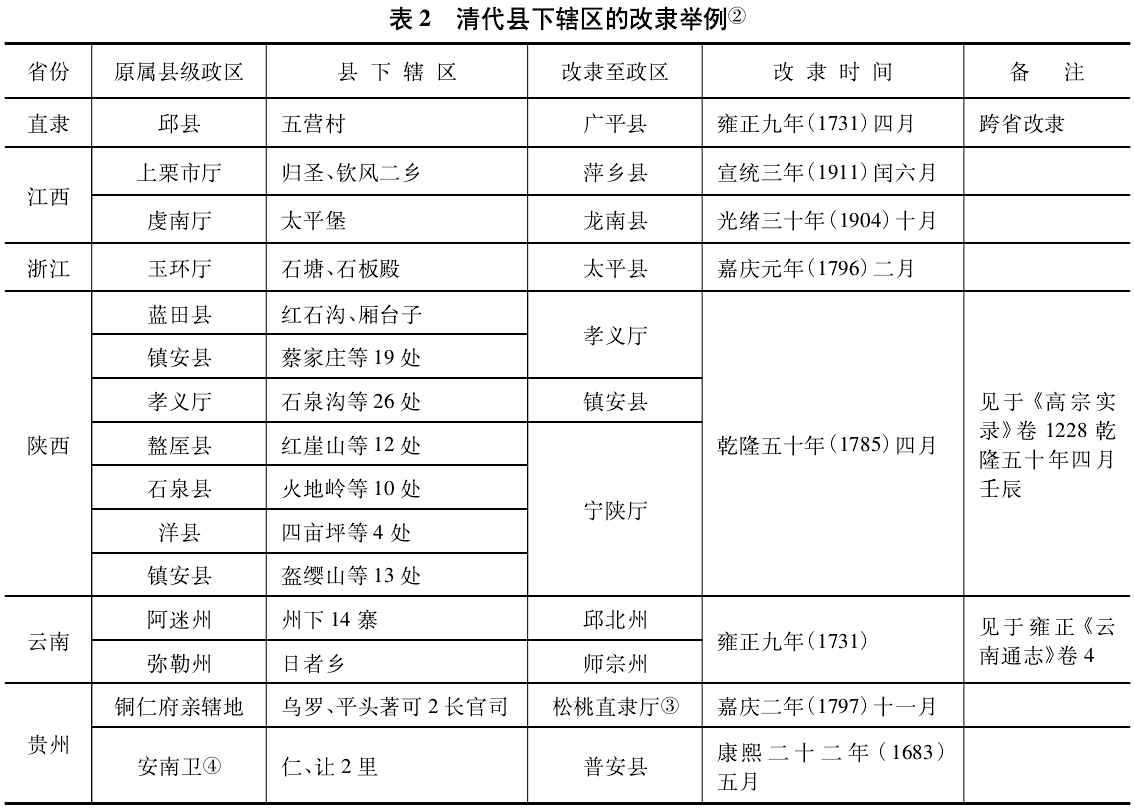 除了考虑县域面积适中性,清朝也十分注重行政中心(衙署)的有效辐射范围与行政效力,因此县级政区边界地带不宜距行政中心过远。这方面,清代县下辖区改隶是一个重要表现。清代距离本县行政中心较远、不便控制的县下政区单元改隶邻县的情形,多缘于此,例如:原属山东东昌府邱县的“五营村”地,“署直隶总督唐执玉、会同河东总督田文镜疏言:东省邱县之五营村庄,地处极西,孤悬北直界内,请改归直隶广平县管辖。应如所请。从之”。雍正九年(1731)四月改隶相邻的直隶广平府广平县。这实质也是通过界线调整手段来调节基层州县幅员,不过这种调整一般在县下辖区管辖范围较明确的基础上。表2中县下政区的改隶,以陕南、云南、贵州等开发较晚的区域为主。这些调整都与新设县级政区密切相关,“母县”分出地域增置新县、县下辖区改隶的过程,其实也是基层地域重组、调适县界的契机。