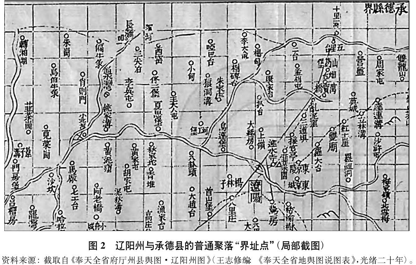 随着清代人口增长与县下地域开发,越来越多普通聚落成为州县划界的界址点,在山川地理形势不显著的地域表现尤为明显。这些普通聚落在河网密布、聚落密集的江南等地,有些表现为“边界市镇”,因其本身具有一定幅员而常具“跨界”特征。作为界标,县界可以穿过市镇内部(民居、街巷、桥梁、运河水网等),市镇空间即被分属两个甚至多个不同政区单元。清末这样“以市镇为边界”的现象在浙江省境内(尤其杭嘉湖等府)就有17例,其中8例明确归属为多县共管。作界址点的普通聚落在东北、西北、华中等地,村庄、村寨“点状”属性更明显,尤其东北开发较晚、移民流入,甚至三两户即可成村,聚落面积小,归属也相对明确,较少出现聚落两属的情形。例如光绪年间的奉天地域在建省前已有一定数量移民流入,设置了21个县级政区(2散厅、5散州、14县),县界划定中有不少以普通聚落作为界址点的情况。像辽阳州西北与承德县界一带基本没有大山大河,就主要以普通聚落点划界。由光绪二十年(1894)《奉天全省府厅州县舆图·辽阳州图》,可见辽阳州西北与承德县以“转湘湖—朱岗—偏牛录—三尖泊—西窑—哑巴台—李大人屯—杨甸”等为界址点串联成界线,上述界址点归属辽阳州一侧,如图2所示。奉天建省后,随着县级政区分设、增置,更多普通聚落界址点的选取,主要考量的是县级政区幅员的大小适中。