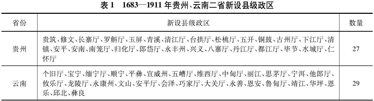贵州、云南等边疆省份改土归流后,往往存在所辖州县稀疏、县域过大的情形,清廷一般分两步解决这类问题。首先在县级政区内增派分防佐杂官员,其功能类似于州县官员。佐杂官员有明确辖区,在郡县化过程中起到了过渡作用,可视为独立的“准县级”政权。待人口充实、条件成熟时,县下辖区可升置县级政区。其稳定的治理辖区与明确的管辖界线,为辖区调整以及新设县级政区的政区结构体系生成奠定了良好基础。如前文提及的雍正五年黔桂二省勘界时新设贵州南笼府永丰州,治长坝,同时设州同驻册亨,管理册亨、罗烦等州下四甲,设州判驻罗斛,管理东北罗斛四甲之地,都具有明确的辖区和界线。乾隆十四年(1749)十月,罗斛州判及其辖区划归贵阳府定番州,为定番州罗斛州判。类似的还有原普安州黄草坝州判地升置兴义县、云南师宗州邱北州同所辖日者乡并阿迷州十四寨地置邱北县、镇雄州彝良州同地升置彝良县等。总之,治乱理正、推动政区一体化,客观上促进了边疆地区各级政区界线的明晰化,在界线明确、辖区稳定的格局中,基层县级政区快速充实了清代滇黔的空间版图(表1),也一定程度上缓解了边疆地区州县辖境过大、不易控御的问题。