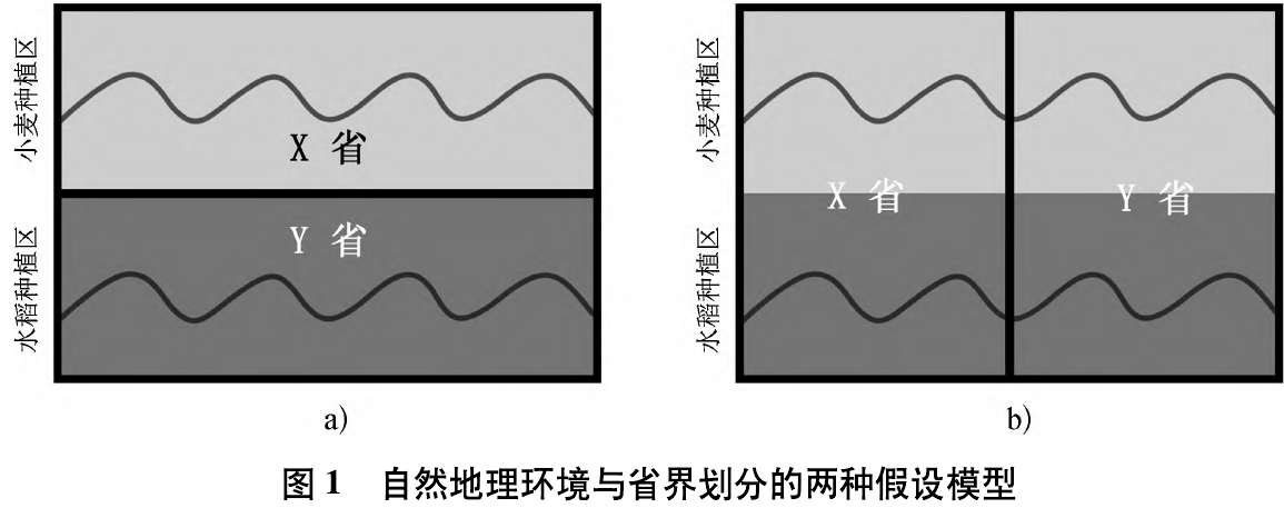 边界作为行政区划的核心要素之一,自郡县制萌芽以来,上到统治者、下到地方乡绅百姓,边界概念和意识都在不断深化。秦汉以来,政区划分与调整成为中央集权行之有效的行政手段。中国古代政区边界划定与管理的两大原则:一是要利于集权统治,二是要遵循边界与地理环境的协调性。于是,“山川形便”与“犬牙相入”成为最重要的两条划界原则。既往以周振鹤为代表的学者基于这两条原则,对中国传统政区尤其是高层政区、统县政区的划界问题已阐释得十分深刻。后来者们在探讨基层政区边界划定理念时发现中国古代县界的划分也大多适用“山川形便”原则,偶有“犬牙相入”之错壤,进一步论证和扩展了两大原则的应用范围。上到省界、下至县界,一般边界与自然地理环境契合度越高,地方行政效率越能得到保证。孙传炜等曾建立了一个假设模型(图1),图中波浪线表示河流,a图表示X省与Y省各自管理生产方式一致的一片完整地区和流域,b图表示水稻/小麦种植区与两条河流流域分别被X省和Y省切割管理。