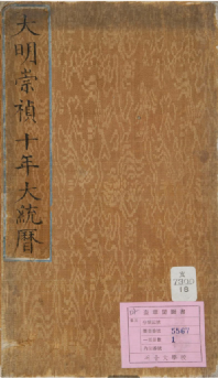 韩国奎章阁藏有《大明崇祯十年大统历》(1637)一册,编号:奎中5567,长宽规格31.4×18.4cm,为木刻版本。明朝官方颁行之大统历日有两种:民历与王历,每年供给朝鲜民历百本、王历一本。根据内容可以确定,《大明崇祯十年大统历》是明代普通官民所用的民历。[2]《大明崇祯十年大统历》与普通民历封面不同,如图1: