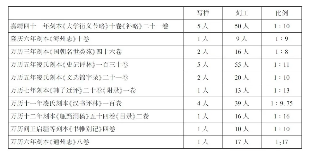 更早的明代刻书,情形与之相仿。明嘉靖三十五年(1556)锡山顾氏奇字斋刊本《类笺唐王右丞诗集》卷前列出“开局氏里”,有“写勘”即写样3人,“雕梓”即刻工24人,比例为1∶8。此外,李国庆《明末江浙地区雕版刻工合作形式及其生计例说》搜集并分析了45个实例,其中有不少可直接反映写样工匠与刻工的配置情况,如下表所示,也多在1∶8—1∶10的区间内。