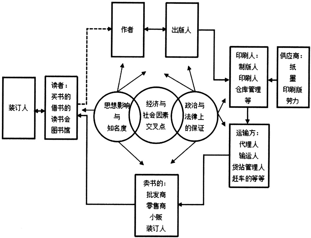 “交流循环”(communications circuit)是西方书籍史学者罗伯特·达恩顿(Robert Darnton)提出的一种书籍史的观照视角。在达恩顿看来,因为书籍是人们沟通和交流的媒介,所以研究书籍就是研究人们的沟通与交流。书籍之所以成为媒介,大的方面是把作者的想法和观念传播到各处,阅读者由此改变了思想和行为;小的方面是从书籍本身的撰作、生产、销售、发行、流通、运输、购买、借阅到阅读接受,无时无刻不处在一个从很多人到很多人的协作、交流和传递过程之中。书籍史研究者不仅需要探讨这一过程中的每个环节,也需要研究这一过程的整体在不同时间地点的表现形式以及同周边其他经济、社会、政治以及文化系统之间的关系。这样,才能够做到把书籍当作一种人类的沟通手段来看待①。