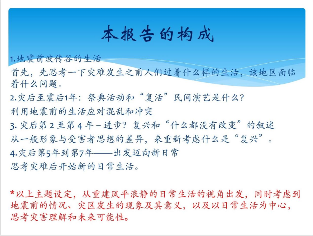 政冈教授认为,通过“契约讲”“春祈祷”等原有的地域社会组织和民俗活动在灾后的变化,可以看出在灾后重建中,重建“灾前日常生活”在一定程度上会发挥积极作用。另外,要在理解当地生活变迁的重建过程中,重视民众的困惑与诉求的变化。同时,在实施重建项目、政策上,既要强调各地区的共性,也不能忽视各地区的个性。