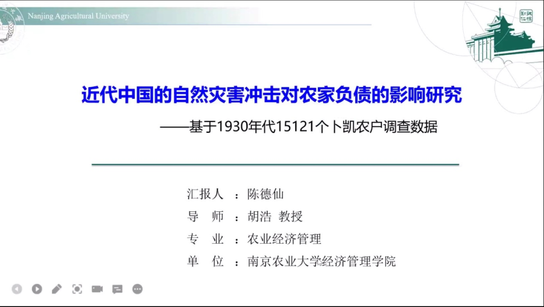 第四位报告人是来自南京农业大学经济管理学院博士生陈德仙,主题为《近代中国的自然灾害冲击对农家负债的影响研究——基于1930年代15121个卜凯农户调查数据》(见图9),其报告主要分为六个部分。