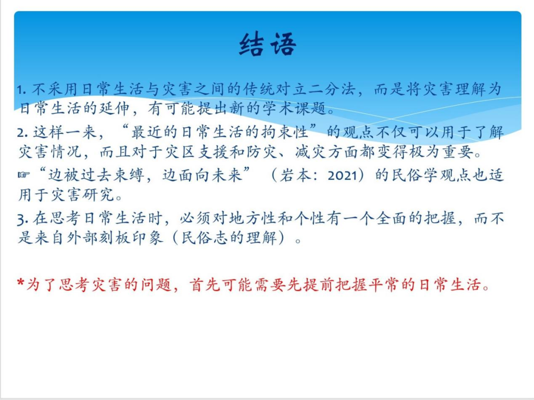 最后,政冈教授对今天的讲座内容进行了简要的总结,并就日常生活和灾害提出了自己的看法:不要将二者视为二元对立,灾害其实是日常生活的延伸。在思考日常生活时,要做实地考察,把握当地的个性与共性,切忌带着外部的刻板印象去研究(见图3)。