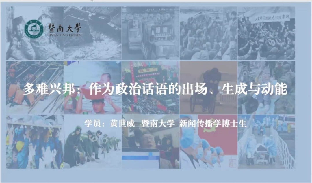 第二位报告人是暨南大学新闻与传播学院博士生黄世威,主题为《多难兴邦:作为政治话语的出场、生成和动能》(见图7),其报告主要分为五个部分。
