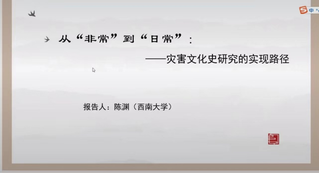 第三位报告人是西南大学历史文化学院博士生陈渊,主题为《从“日常”到“非常”——灾害文化史研究的实现路径》(见图8),其报告主要分为三个部分。
