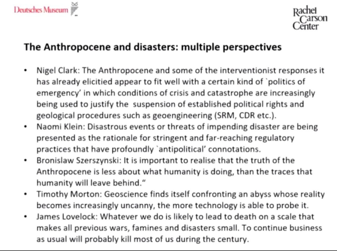 在第四部分中,崔施勒教授提到了自己对“人类世”相关概念的理解、研究的总结及展望。他认为,“人类世”这个概念可以作为继管理和承受灾害之后的第三种灾害史研究范式,与此同时“人类世”挑战了在过去的灾害史研究中所忽略的人文因素,希望“人类世”将来可以将视点放在整体地球生态框架之中。
