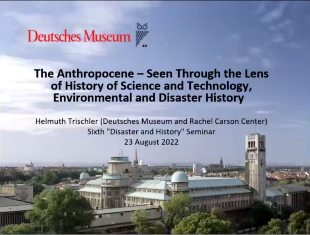 下午三点,由德国德意志博物馆研究部主任、慕尼黑大学蕾切尔·卡森环境与社会中心联合主任、慕尼黑大学赫尔穆特·崔施勒(Helmuth Trischler)教授进行第四场专题讲座,讲演题目为《从科技史、环境史和灾难史的视角看人类世(The Anthropocene–Seen Through the Lens of History of Science and Technology,Environmental and Disaster History)》(见图4),中国灾害防御协会灾害史专业委员会主任、中国人民大学生态史研究中心夏明方教授担任主持人。