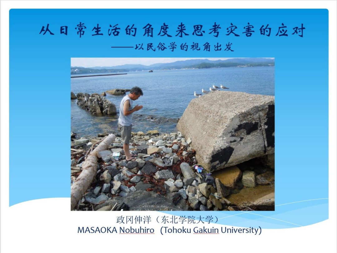 报告伊始,政冈教授介绍了“民俗学”这一概念及其发展至今的新思潮,并将其与灾害研究联系起来,认为从民俗学视角来进行灾害研究是一种独特且可行的研究角度。而后政冈教授介绍了如何从民俗学的视角,以日常生活为中心,理解东日本大地震所带来的混乱和灾害应对措施。
