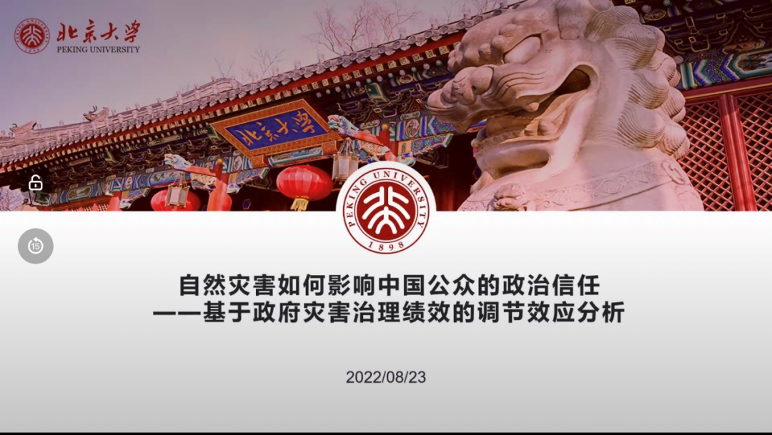 第一位报告人是北京大学政府管理学院博士生曾扬,主题为《自然灾害如何影响中国公众的政治信任——基于政府灾害治理绩效的调节效应分析》(见图6),其报告主要分为四个部分。