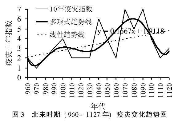图3是北宋时期“十年疫灾指数”[126]的变化趋势图。图上显示,北宋时期的疫灾频度有缓慢上升的趋势(斜率为0·1667),疫灾频度越来越高,但并不是直线的上升,而是周期性的波动上升。168年间,除960-969年上接五代疫灾周期和1120-1129年下接南宋疫灾周期外,其余可以划分出3个波长为50年的波动周期:第一波(970-1019年)波峰值为4,波谷值为1,疫灾频度为10%-40%;第二波(1020-1069年)波峰值为6,波谷值为2,疫灾频度为20%-60%;第三波(1070-1119年)波峰值为7,波谷值为2,疫灾频度为20%-70%。总体看来,北宋时期后期较北宋时期前期疫灾频繁,而以11世纪后半叶最为突出, 1040-1099年的60年间,疫灾之年高达31个,占到整个北宋时期疫灾之年的一半以上。