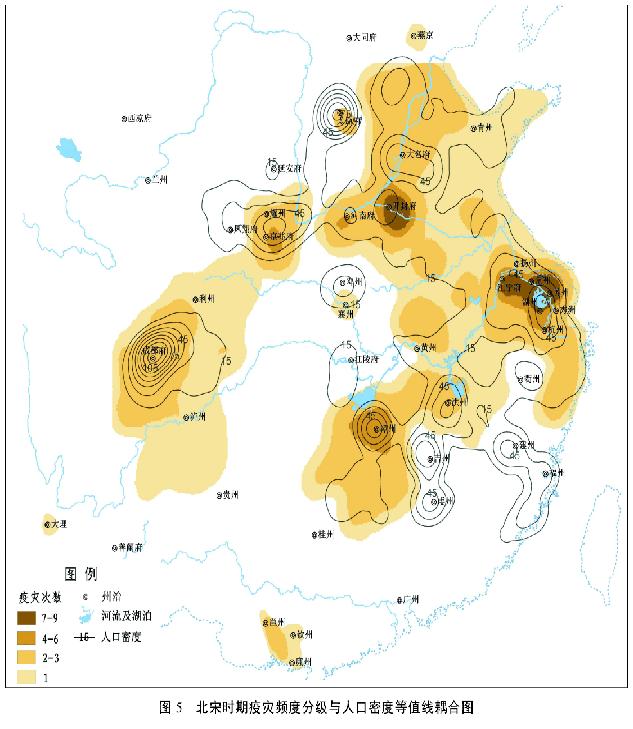 根据我们的研究,魏晋南北朝时期,我国的疫灾重心就开始呈现出逐步南移的趋势[128];到隋唐五代时期,南北方的疫灾年数已经基本持平[129]。那么,北宋时期的情形又如何呢?图5是北宋时期的疫灾频度分级和人口密度等值线耦合图,图中的疫灾频度分级是以州为单位,按照各州发生的疫灾次数通过GIS技术进行空间插值后生成的,图中的人口密度等值线是以州为单位,根据崇宁年间各州人口数[130]和国土面积通过GIS技术进行空间插值后生成的。图4显示,北宋时期形成了长三角、开封府两个一级疫灾中心,京兆府(西安)、河南府(洛阳)、潭州(长沙)、成都府等几个次一级疫灾中心;而疫灾危及的范围,南方明显广于北方,疫灾累积发生的面积,南方更是远远高于北方。显然,北宋时期的疫灾重心转移到了南方,尤其是长三角地区,整个地成为了疫灾高发区。疫灾重心的这种变迁趋势和特点,与我国经济重心的变迁趋势和特点高度地一致,这说明疫灾流行与经济发展之间一定有某种必然的联系。从长三角地区的经济发展来看,人口密度和人口流动性显然就是这种必然联系的中介。这是因为,无论是古代还是现代,人口密度的高低实质上反映了经济水平的高低,人口流动性的高低实质上反映了城市化水平的高低。宋代长三角地区拥有最高的人口密度和城市化水平是其成为全国最大的经济中心和疫灾中心的根本原因。同样,都城开封府成为北方地区的疫灾中心,也主要是因为其人口密度高,人口流动大的缘故。